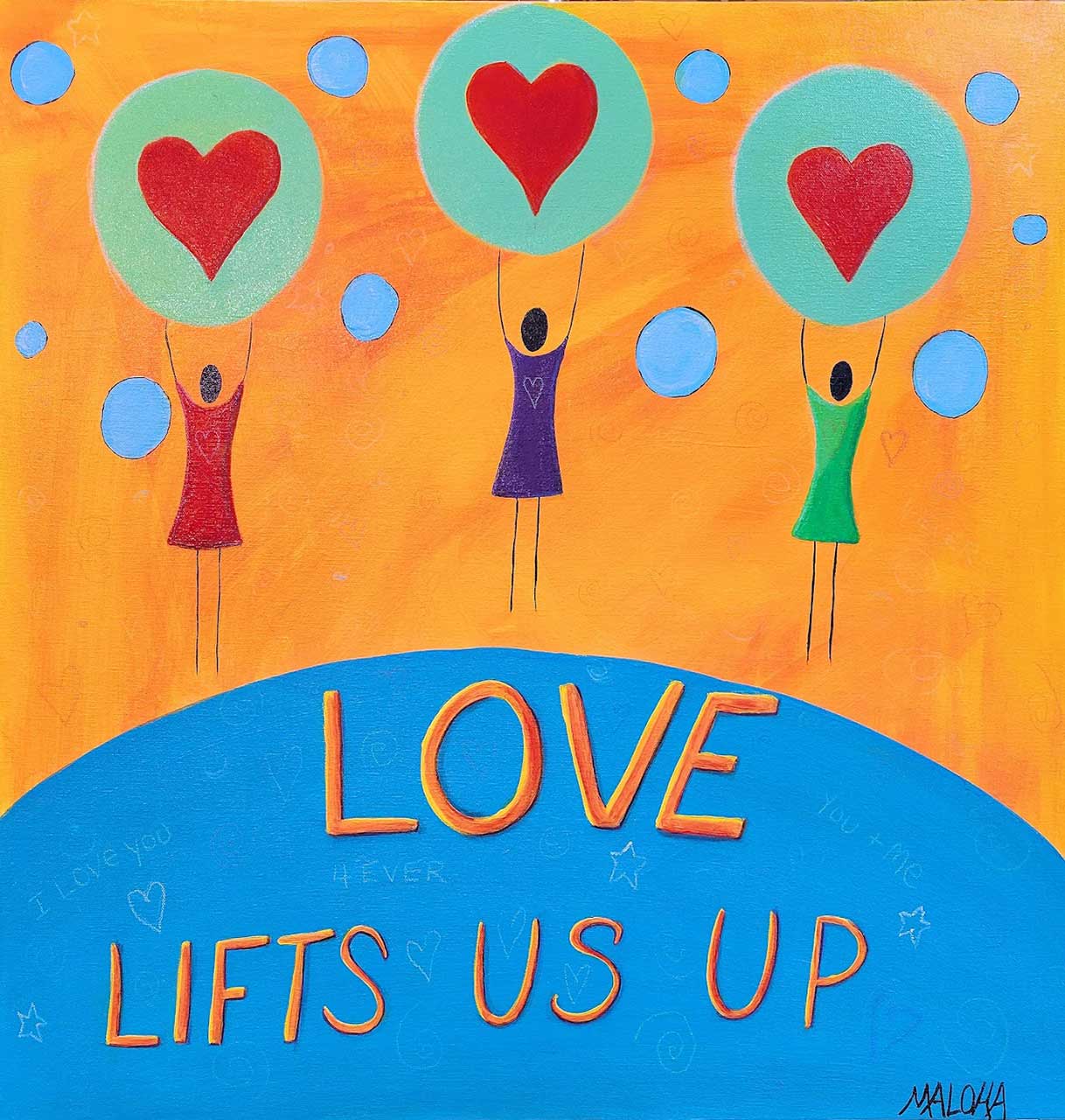 A whimsical piece that reminds us that love will lift us up! On gallery wrapped canvas, sides painted, wired, and ready to hang.