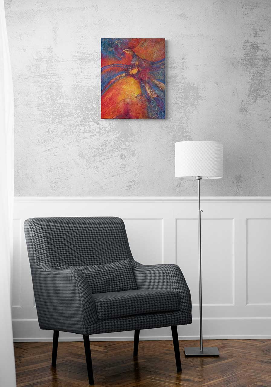 Richly colored, full of texture and mixed media from this initially non-objective painting – the Phoenix appeared. It’s true that when you let yourself go, the painting will lead you to its rightful conclusion.